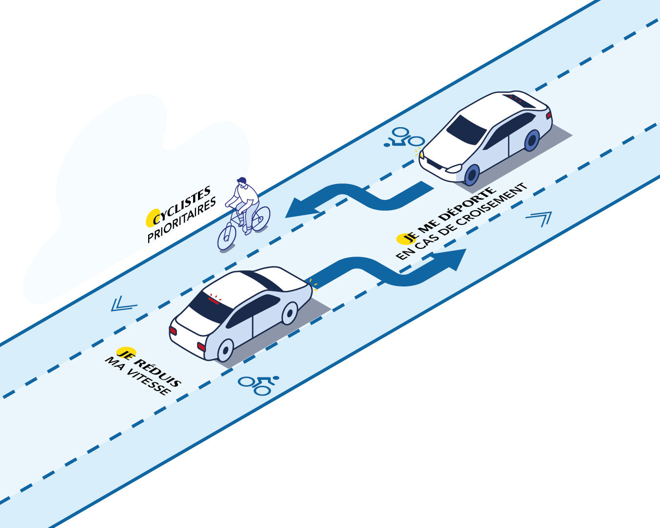 - Lorsqu’il y a un véhicule dans l’autre sens et un vélo sur la bande latérale : Le cycliste est prioritaire sur la bande cyclable, alors le véhicule se rabat derrière le vélo et attend que l’autre véhicule soit passé pour se repositionner sur la voie centrale.