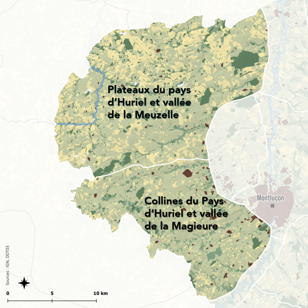Deux unités paysagères composent cet ensemble, les "plateaux du pays d’Huriel et vallée de la Meuzelle" et les "collines du Pays d’Huriel et vallée de la Magieure".