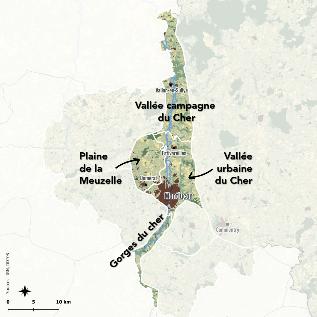 4 unités paysagères composent cet ensemble, "les Gorges du Cher", "la Vallée Urbaine du Cher", "la Plaine de la Meuzelle" et la "Vallée-Campagne du Cher".