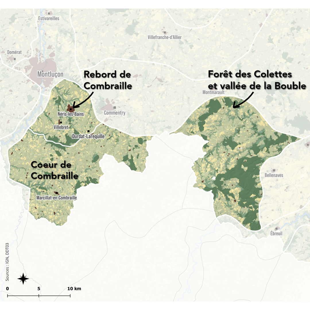 Trois unités paysagères composent cet ensemble, "le Rebord de Combraille", "le Coeur de Combraille" ainsi que "la Forêt des Colettes et vallée de la Bouble".