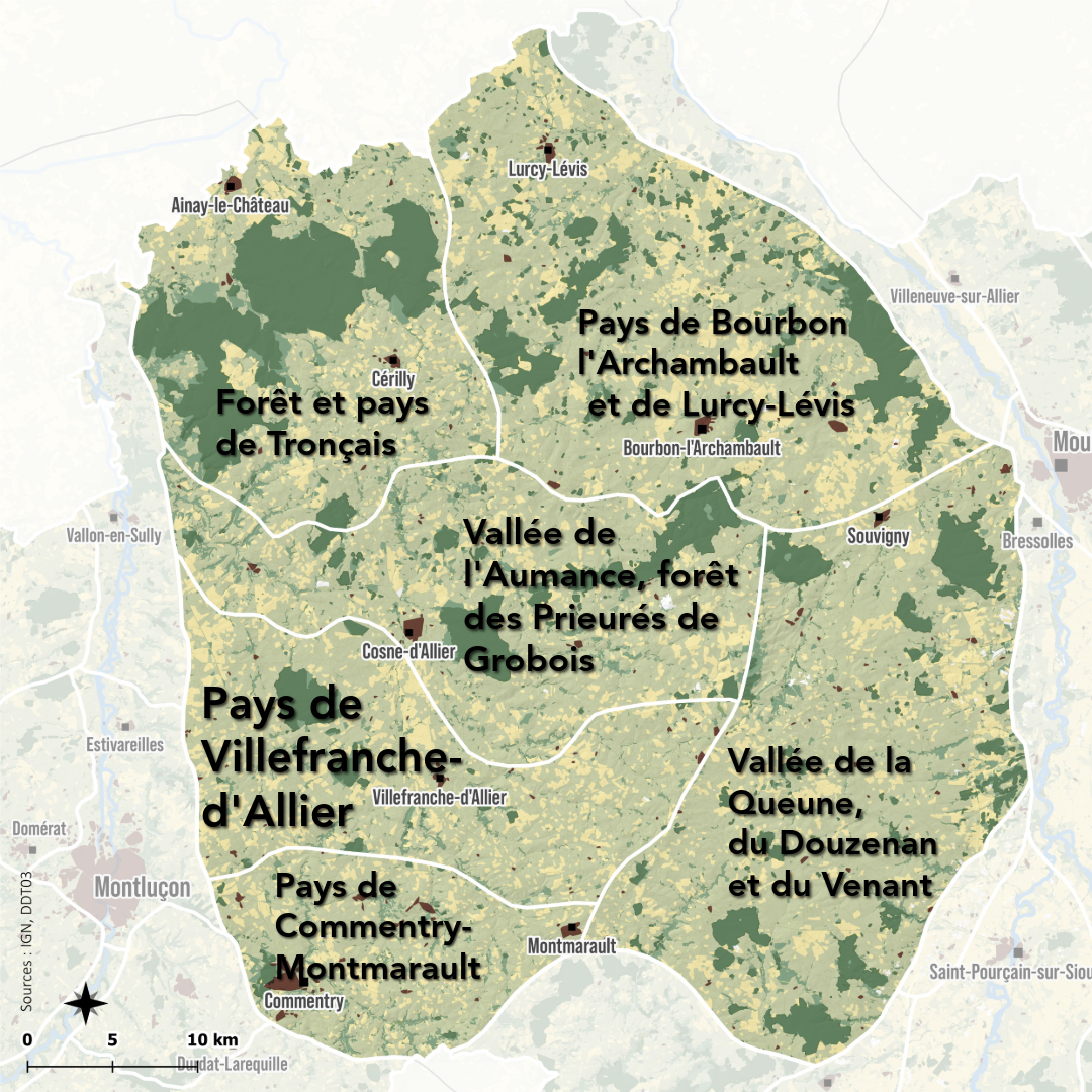 Six unités paysagères composent cet ensemble : «Forêt et Pays deTronçais», «Vallée de l’Aumance, forêt des Prieurés de Grobois», «Pays de Villefranche-d’Allier», «Pays de Commentry-Montmarault», «Vallée de la Queune, du Douzenan et du Venant», «Pays de Bourbon-l’Archambault et de Lurcy-Lévis».