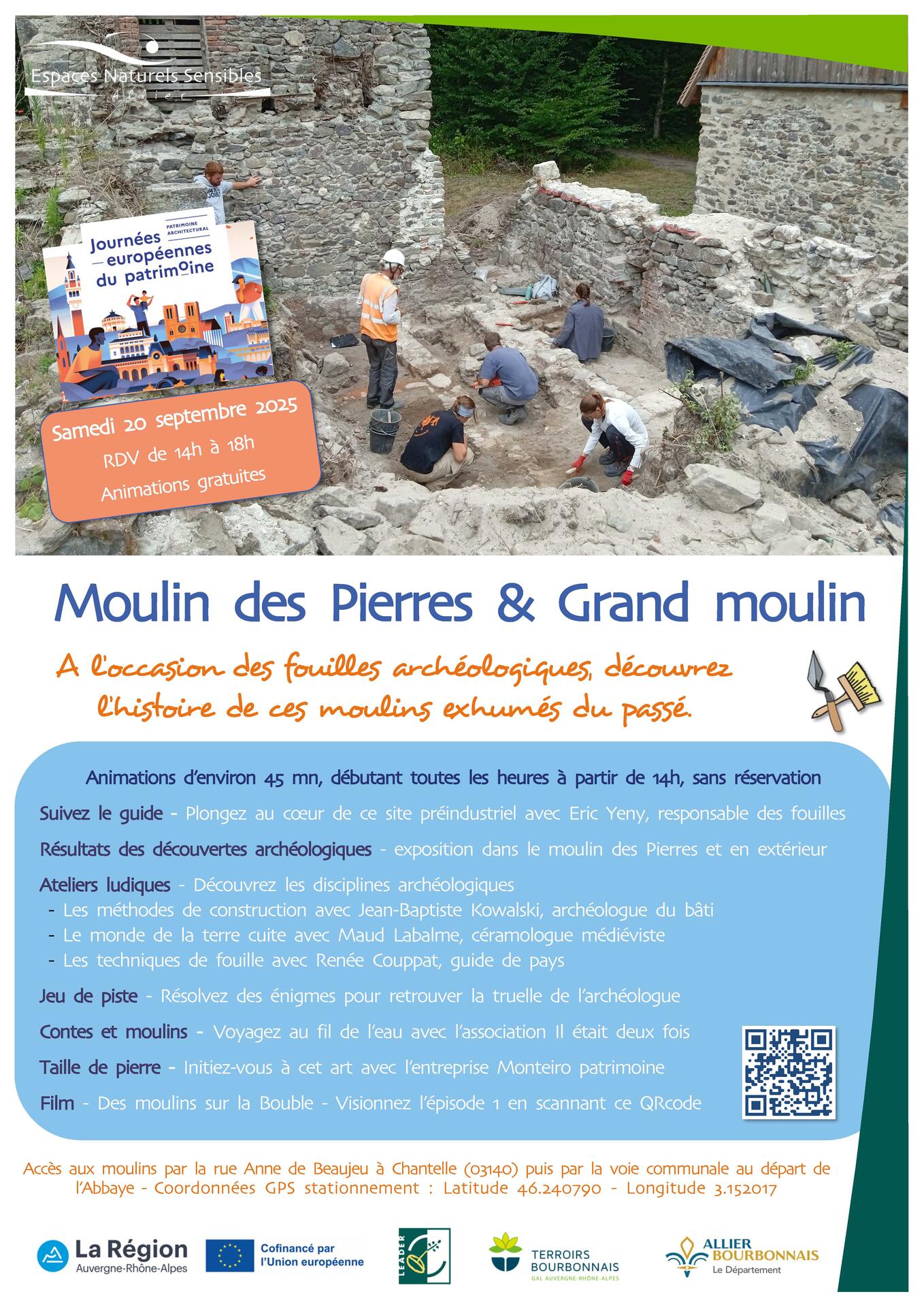 Samedi 20 septembre, de 14h à 18h, les fouilles archéologiques du moulin des Pierres et du Grand moulin à Chantelle se découvrent à l’occasion des Journées européennes du Patrimoine.