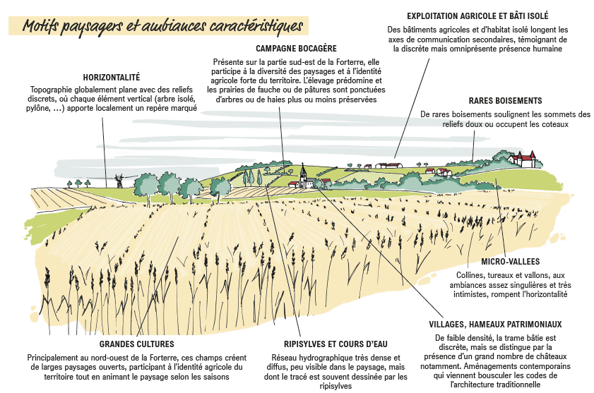 Le nord ouest de l’ensemble est un plateau ouvert de grandes cultures, tandis que le sud-est est davantage caractérisé par des paysages de campagne bocagère liée à l’élevage.